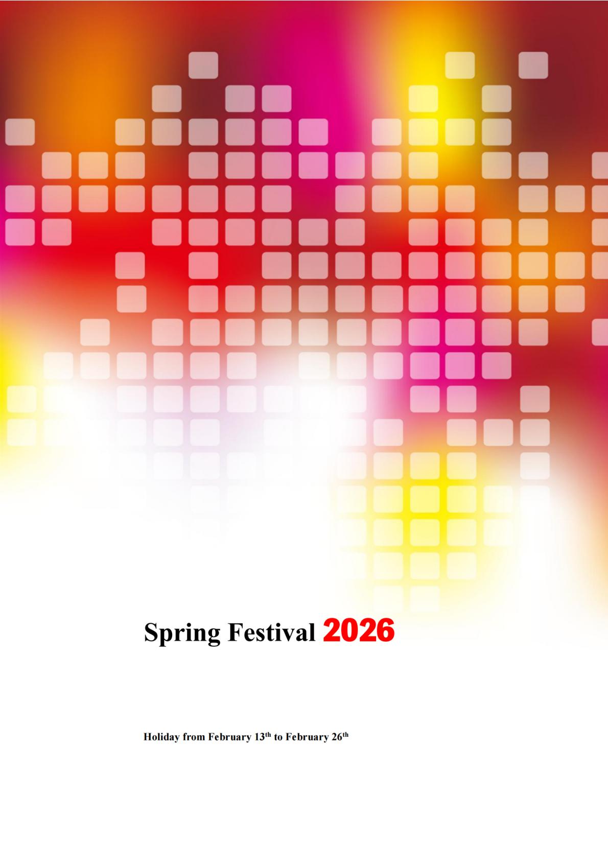 The Spring Festival holiday(Chinese lunar new year holiday) is from February 13th to February 26th.2026-01-16